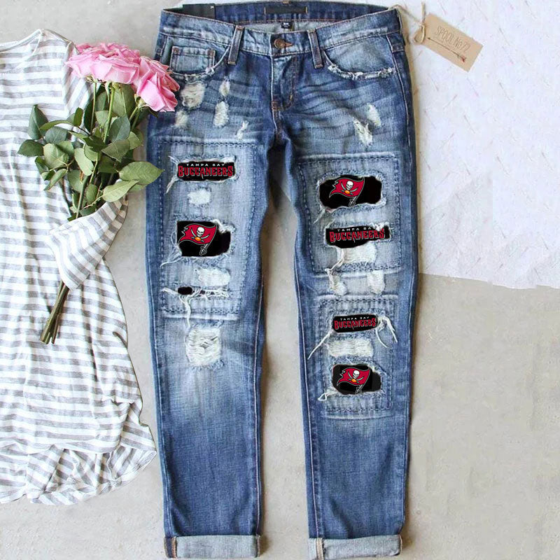 casual fashion perforated printed jeans