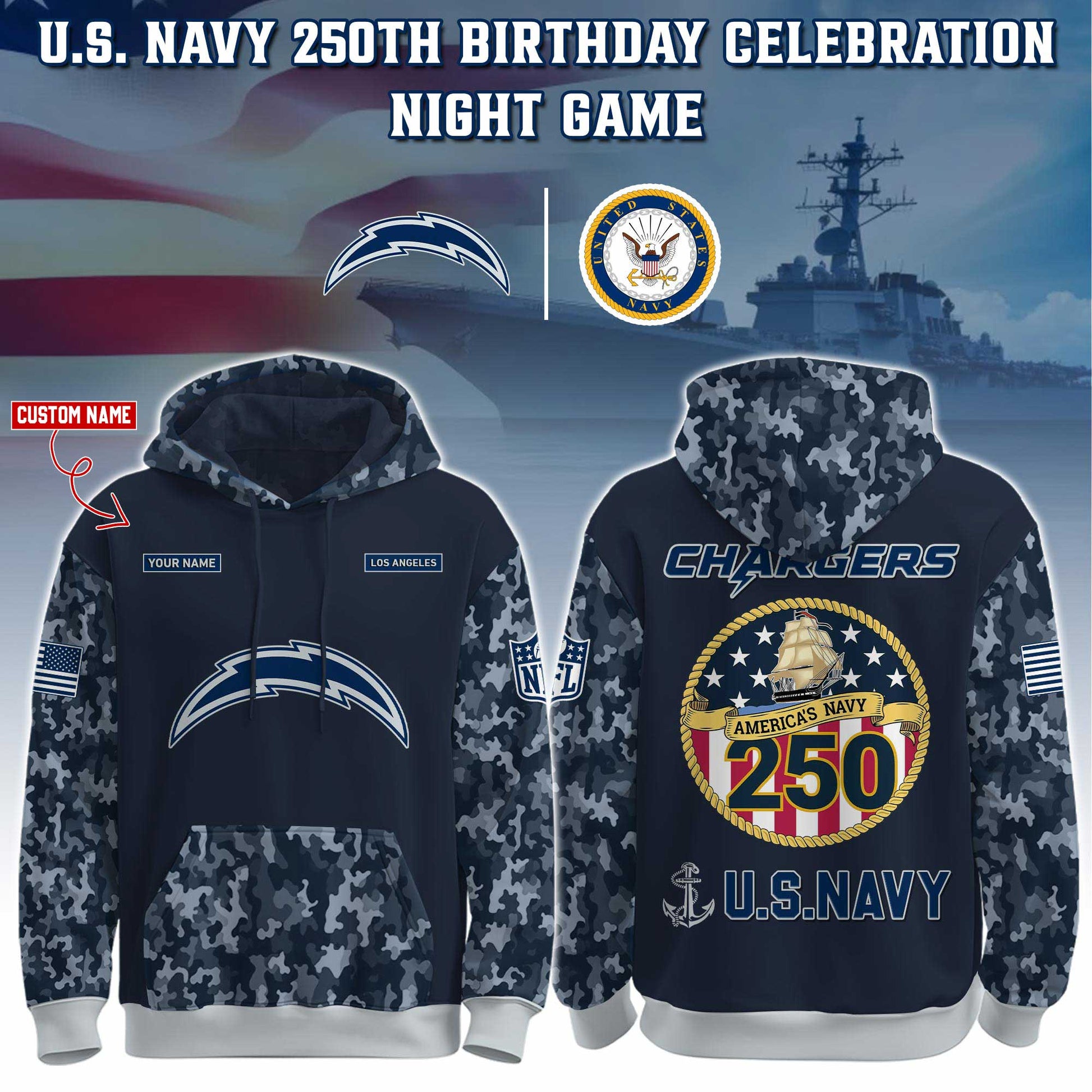 Los Angeles Chargers Navy 250th Birthday Hoodie Limited Edions