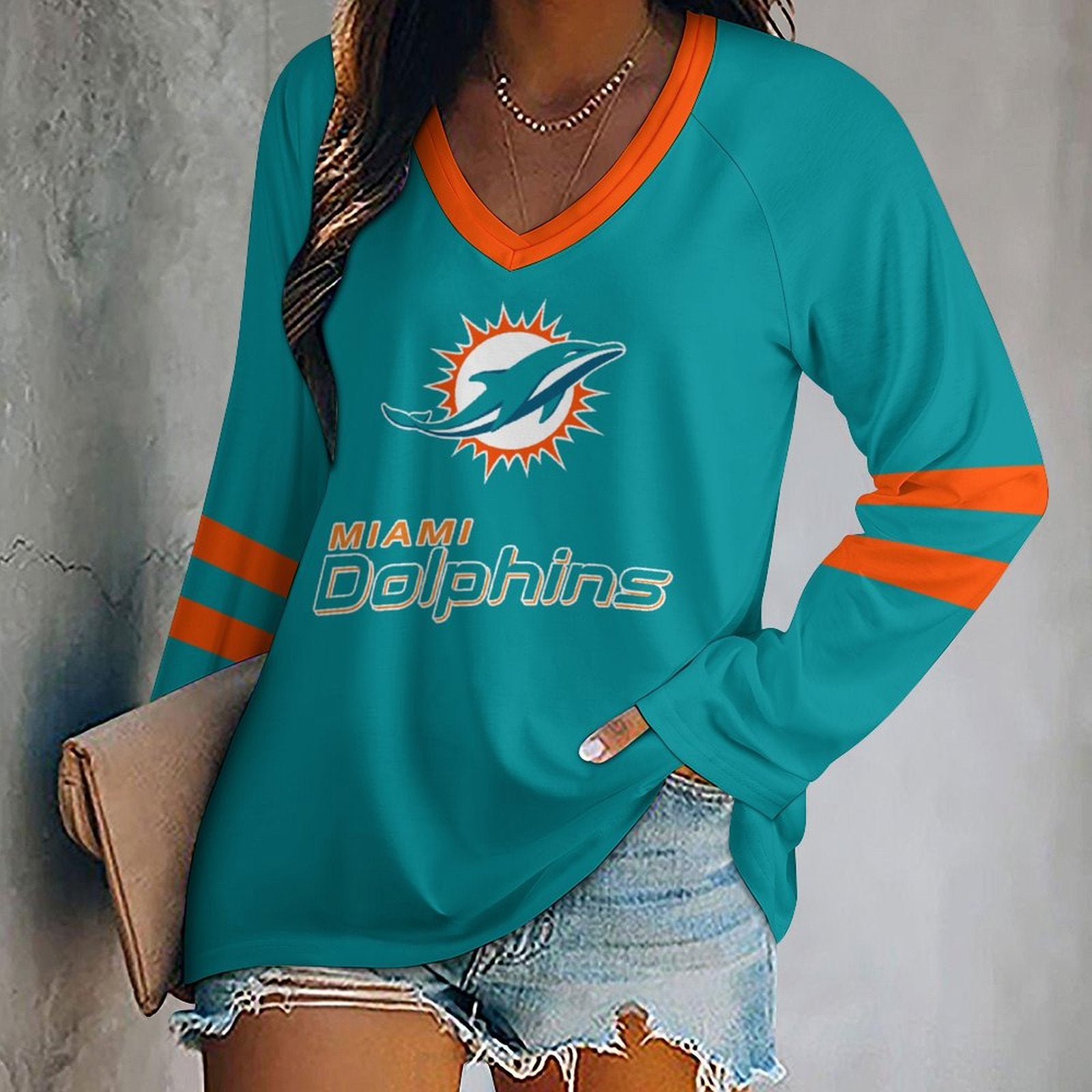Miami Dolphins Women's V-neck Double-layered Long-sleeved Loose T-shirt